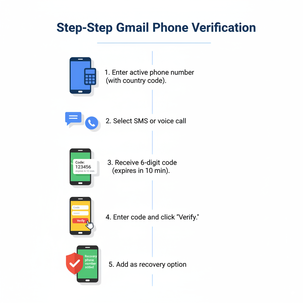 Step 4 → Enter the verification code exactly as received, then click “Verify” to complete the process and regain Gmail access.