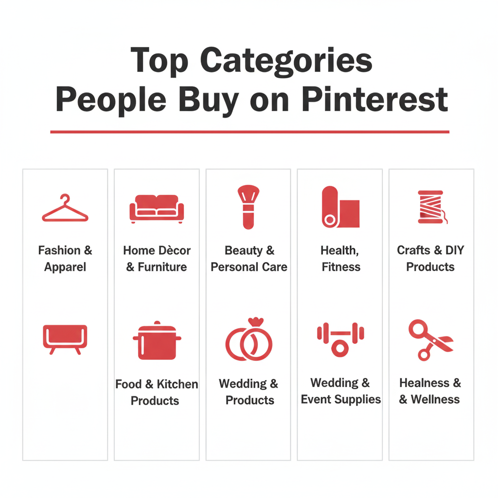 Pinterest users consistently purchase products across seven major categories: fashion and apparel, home décor and furniture, beauty and personal care, food and kitchen products, wedding and event supplies, health and fitness items, and crafts and DIY materials.